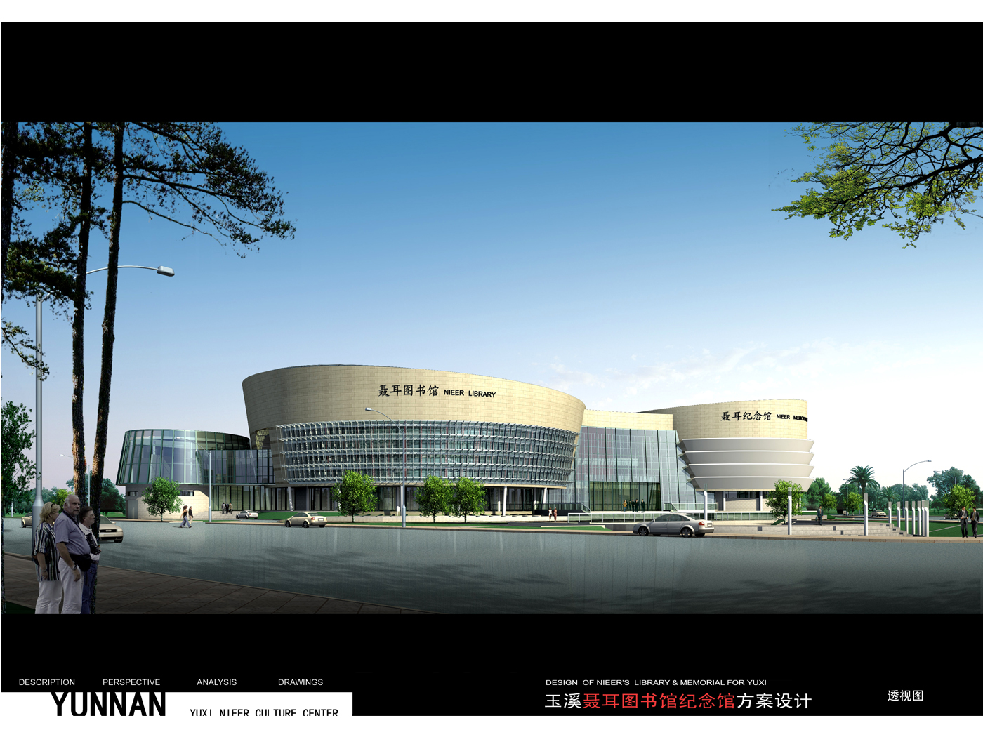 該工程包括兩項內容,即聶耳圖書館、聶耳紀念館。建設基地位于玉溪九大項目之一的玉湖之畔,北臨環湖路,東臨棋陽路,呈三角形,基地大小為20畝。 二館東臨全民健身中心,北面玉湖景區和聶耳文化廣場,朝向、景觀均佳。